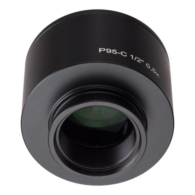 This is a 0.5X C-mount lens for Zeiss microscopes. The lens adapts C-mount cameras with sensors in the 1/1.8″ to 1/2.5″ range, to Zeiss’ Primo and Axio models.